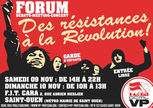 De la salle, des camarades ont des interventions préparées, à propos du Maroc, du Mali, du Bangladesh, de la Turquie. Puis les questions et réponses se succèdent. Une motion est lue : « Nous saluons et soutenons le mouvement des lycéens contre les expulsions de jeunes sans-papiers ! ». Au fond de la salle, une série de tables de presse, celle de VP et celles d’associations en lien avec VP et/ou qui pouvaient être présentes : Coup Pour Coup 31, Collectif pour la Libération de Georges Ibrahim Abdallah, Femmes En Lutte 93, Saint-Ouen Solidarité Palestine, la librairie Le Point du Jour,le groupe Première Ligne, Plein Phare de PSA, le blog "Où va la CGT ?". Une collecte est organisée pour financer les salles.
