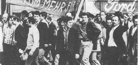 Dans le cas de la lutte des ouvriers spécialisés (OS) de l’usine Ford de Cologne, ce processus prend une figure particulière. L’usine emploie 12 000 ouvriers turcs – soit un tiers du personnel de l’usine et neuf dixième des ouvriers travaillant à la chaîne (sic) –, l’un des plus gros contingents d’Allemagne. Ils travaillent aux postes les plus durs de la chaîne en fin de montage, pour un salaire horaire inférieur de 20 % à la moyenne, à des cadences presque deux fois plus rapides que chez Volkswagen. Ils seront les acteurs de la grève du mois d’août 1973. En quelques jours, chez certains syndicalistes et dans la presse, la nationalité des protagonistes deviendra la seule manière de les désigner et ce que l’on peut qualifier de « grève ouvrière d’usine » se transformera en conflit entre Turcs et Allemands occultant les questions du travail et de l’usine pour mieux souligner l’altérité des ouvriers engagés dans cette grève [2].