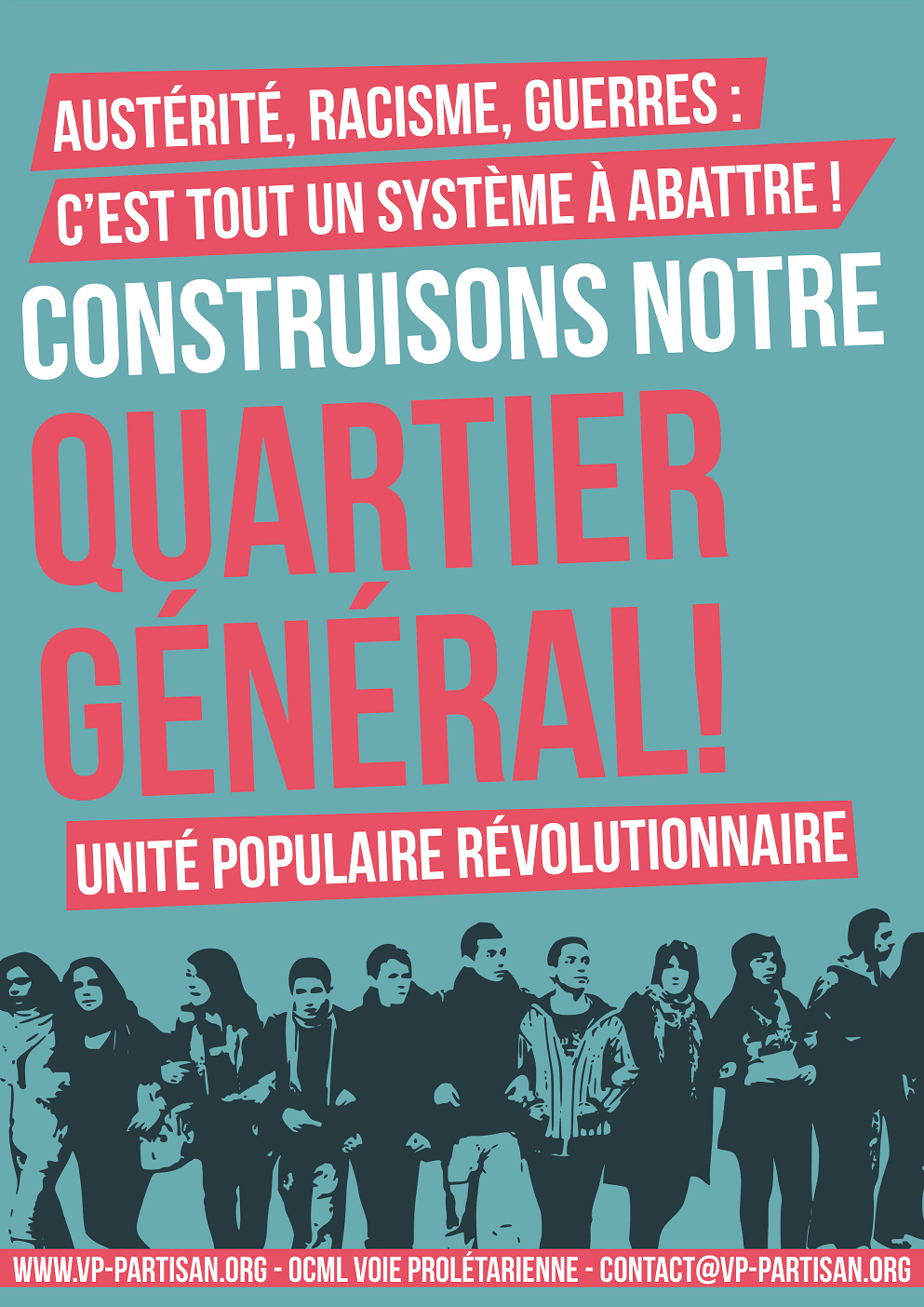 Militer > Construisons notre quartier général ! Affiches et autocollants 2015-04-02 Construisons notre quartier général ! Nouvelle affiche de l’OCML Voie Prolétarienne à imprimer, coller, diffuser ! Impression au format PDF Impression en N&B au format PDF
