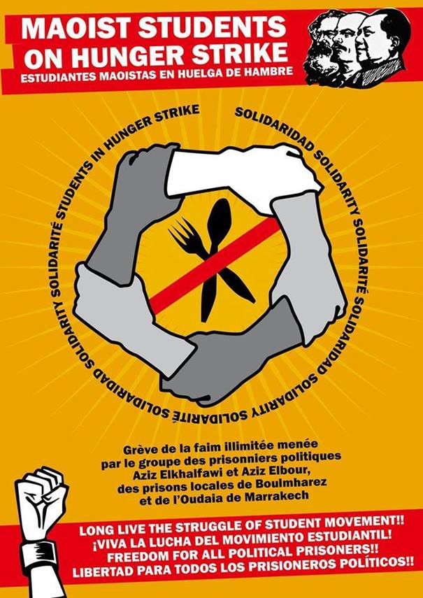 A noter que ces camarades maoïstes ont été dernièrement rejoints dans leur action par d’autres prisonniers politiques (entrée en grève de la faim illimitée pour Abdul Wahab Alramadi et Munir Ashibha, prisonniers de Fès ainsi que pour les étudiants sahraouis de Marrakech ; une semaine de grève de la faim décidée par 11 prisonniers politiques de la prison de Fès et enfin 48 heures de grève de la faim décidées par 5 détenus de la prison de Meknès) ; et par ailleurs, que ce mouvement de résistance s’amplifie jour après jour dans les autres prisons du Maroc.