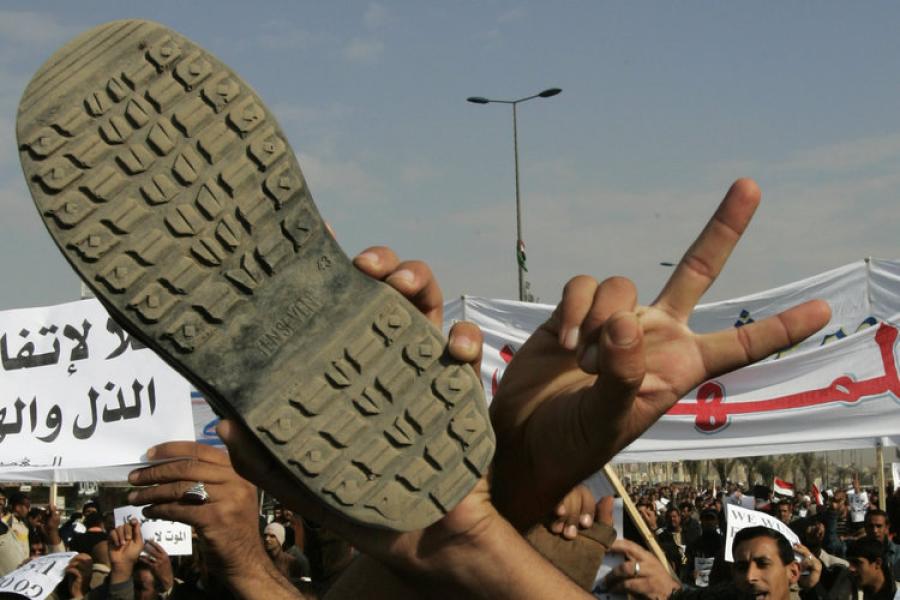 La photo illustrant l’article utilise deux symboles. La chaussure brandie est en référence à ce journaliste irakien qui jeta sa chaussure à la tête de Bush. Le V de la main symbolise la victoire. Deux symboles montrant la résistance des peuples du Moyen-Orient contre l’impérialisme !