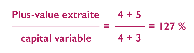 La plus-value extraite par le capital est donc de 4 heures par jour. Pour obtenir ces 4 heures, le capitaliste doit avancer un capital variable (= salaire) de 4 heures. On calcule ainsi le taux de plus-value directe du capitaliste :