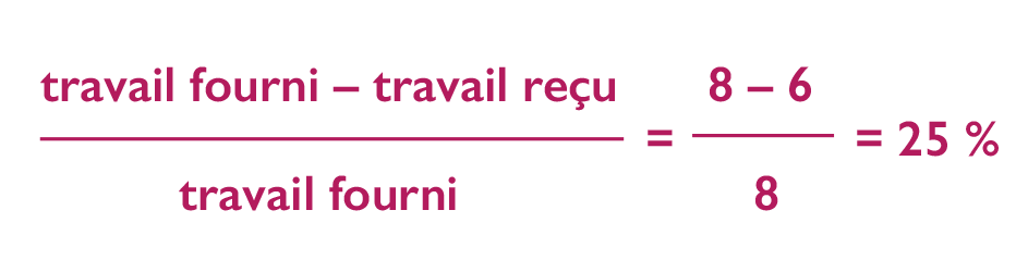 Qu’en est-il pour l’homme et pour la femme ? Chacun a fourni 8 heures de travail mais n’a reçu de travail social (d’eux-mêmes et de la société) que 6 heures. Le reste de leur travail a profité à d’autres (les capitalistes). De leur point de vue, par rapport au travail fourni, leur taux d’exploitation est :