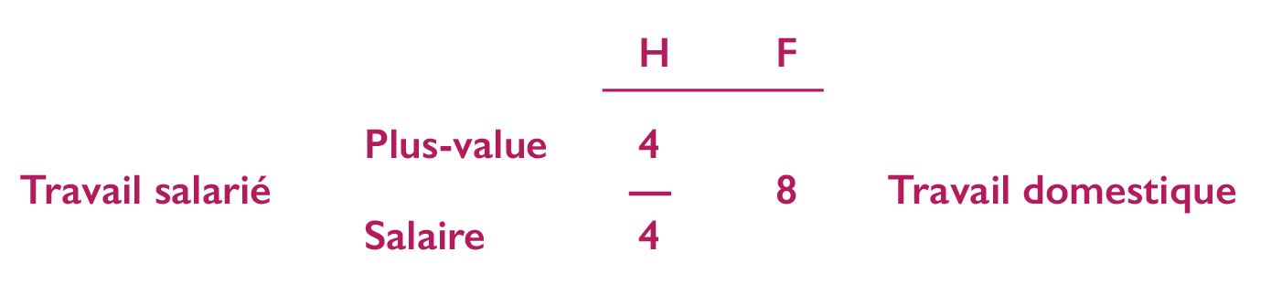 Imaginons que les femmes n’effectuent plus aucune tâche domestique, que tout le travail domestique devienne marchand, capitaliste. Imaginons que l’homme vive, seul ou avec un enfant, dans une pension de famille où tous les services que lui rendait sa femme sont maintenant payés. Ces services seraient plus rationnalisés, mais des salaires s’y ajouteraient aussi le travail social nécessaire à la reproduction de la force de travail (travailleur + son enfant) demeurerait à peu près le même : 6 heures. Si tous les prolétaires sont dans le même cas, les capitalistes devront bien payer l’équivalent de ces 6 heures (nous ne sommes plus en 1830...). Dans une journée de travail de 8 heures, la plus-value tomberait à 2 heures. Le taux de plus-value pour le capitaliste baisserait donc :