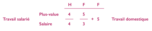 Pour aider à comprendre le mécanisme de l’exploitation indirecte du travail domestique, nous donnons ici un exemple numérique, forcément schématique. Pour faire vivre un ménage d’ouvriers, avec 1 ou 2 enfants, il faut exercer chaque jour 8 heures de travail domestique (cf. encadré 3) : il s’exerce sur des objets de travail (aliments crus, tissus, meubles, etc.) avec des moyens de travail (ustensiles, balais, etc.). La consommation de ces denrées, l’usure de ces ustensiles équivalent environ à 4 heures de travail social dans le cadre de la production capitaliste (on comprendra plus loin pourquoi on donne ces chiffres). Au total, donc, le travail pour entretenir un ménage représente 12 heures : 4 heures de production capitaliste (objets et moyens de travail achetés) + 8 heures de travail domestique. Disons pour simplifier que cela représente 6 heures dont « profite » la femme et 6 heures pour l’homme : 6 heures de travail social nécessaires pour reproduire le travailleur (reproduire sa force de travail présente, et la force de travail future oui le remplacera : son enfant).