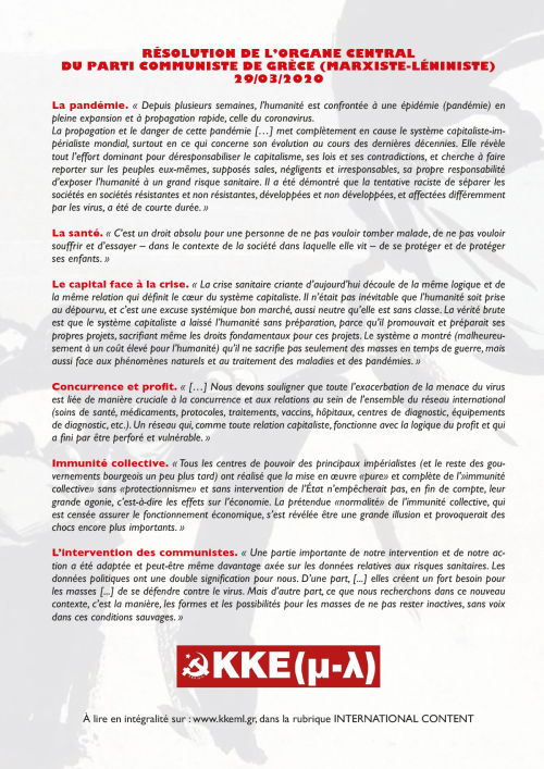 Approfondir > Coronavirus : résolution du KKE(ml) de Grèce Partisan magazine 2020-06-01 Coronavirus : résolution du KKE(ml) de Grèce Partisan Magazine N°15 - Juin 2020 Le document à charger au format pdf en cliquant sur l’image.