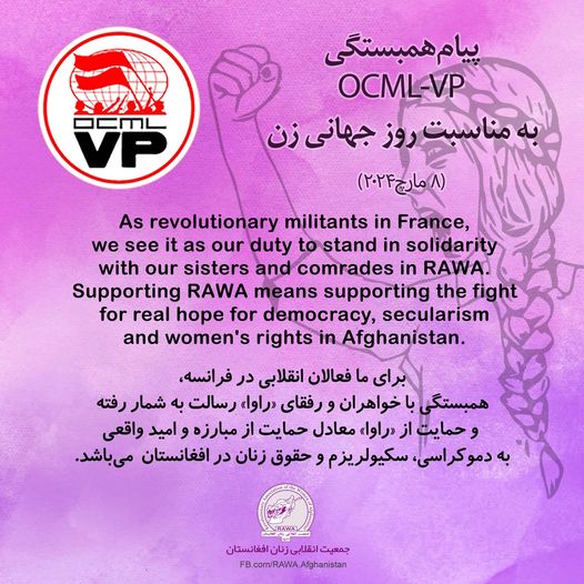 امروز هشتم مارچ، روز جهانی زن را جشن میگیریم، ابتکاری که در سال 1910 توسط کلارا زتکین و سازمان بینالمللی زنان سوسیالیست راهاندازی شد. امروزه باید از آن جایی که در مواجهه با خطر درگیریهای جهانی قرار داریم، باید همبستگی بینالمللی را میان تمامی زحمتکشان -که زنان در خط اول آن قرار دارند- تقویت نماییم. در همین راستا میخواهیم باز هم به خواهران و رفقای دلیر « جمعیت انقلابی زنان افغانستان » (راوا) درود بفرستیم