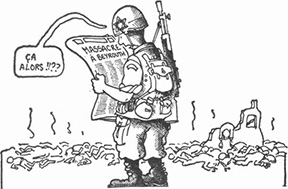 On nous dit que ces massacres n’ont pas été le fait des soldats israéliens eux-mêmes. Israël n’aurait qu’une responsabilité « passive » et non « active ». Belle nuance. Mais comme chacun sait que l’armée israélienne a transporté les troupes, armé les bras des assassins, encerclé les camps, tout vu, tout su, tout permis, l’argument fait long feu.