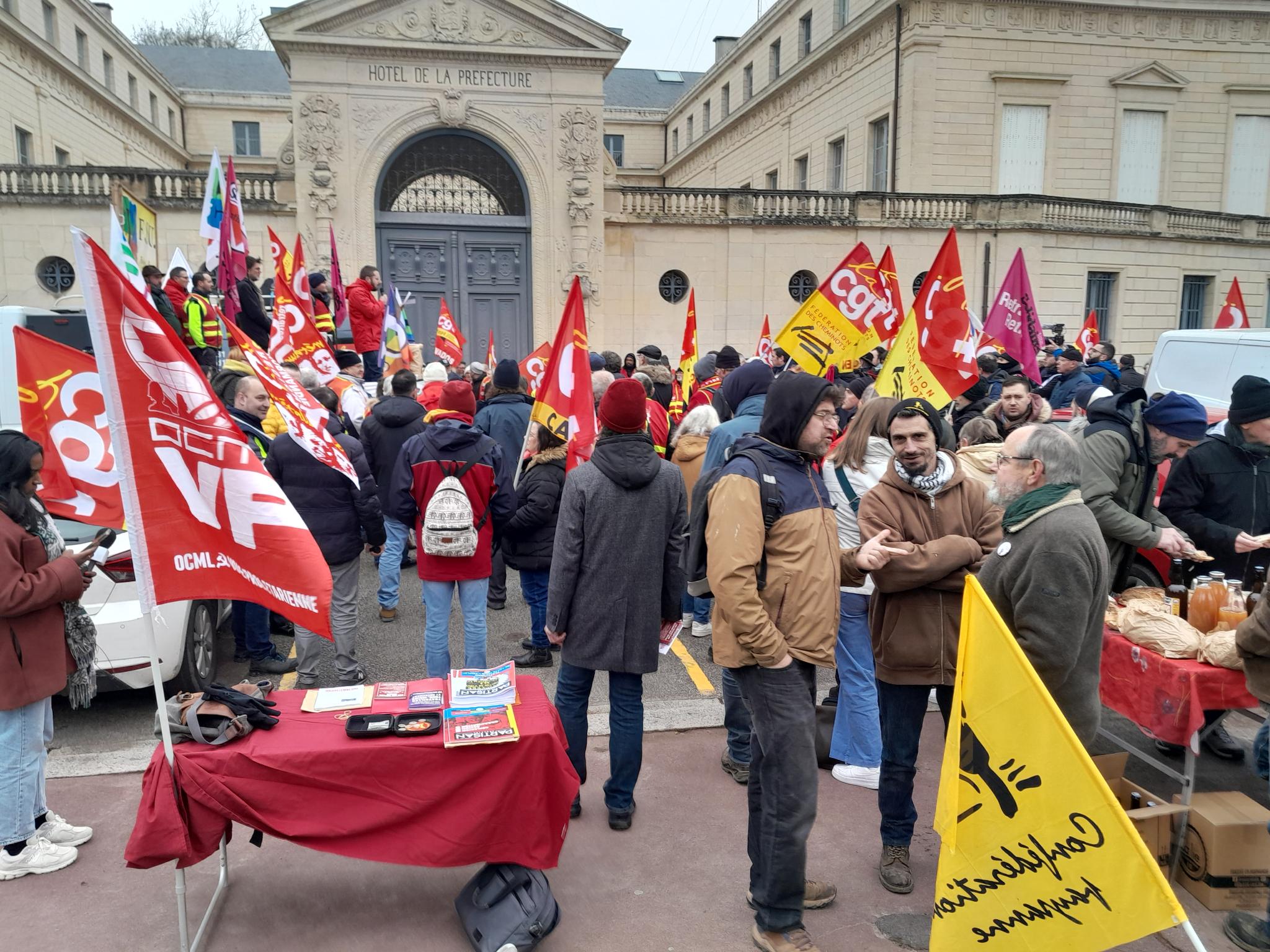 Dans les régions, c’était différent. Beaucoup de petits rassemblements, dans de nombreuses villes moyennes, avec une participation significative : un PSE dans la seule usine d’une petite ville est vite un drame. Nous étions par exemple présents à Caen, devant la préfecture, 200 personnes et un bon accueil, avec notre plateforme emploi (voir https://ocml-vp.org/article2215.html), notre nouvel autocollant contre les licenciements (que nous avons choisi de diffuser largement comme un tract – disponible à notre BP), et la déclaration sur la chute de Assad en Syrie (voir https://ocml-vp.org/article2701.html).