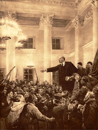 L’insurrection armée des ouvriers, des soldats et des marins de Petrograd (capitale de la Russie) dirigée par le parti bolchevik triomphe presque simultanément à Moscou et dans les grands centre urbains. Le premier acte du nouveau pouvoir des Soviets consiste à « entamer des pourparlers immédiats en vue d’une paix juste et démocratique et à adopter le « décret sur la terre » qui abolit la propriété des terres des grands propriétaires fonciers. Puis, de novembre 1917 à avril 1918, le gouvernement soviétique fait se succéder à cadence forcée les lois et les décrets. II instaure le contrôle ouvrier, la nationalisation des banques et du sol, la création de coopératives de consommation, la suspension des dividendes aux actionnaires des sociétés anonymes, l’annulation des emprunts d’État, le monopole d’État du commerce extérieur, etc.