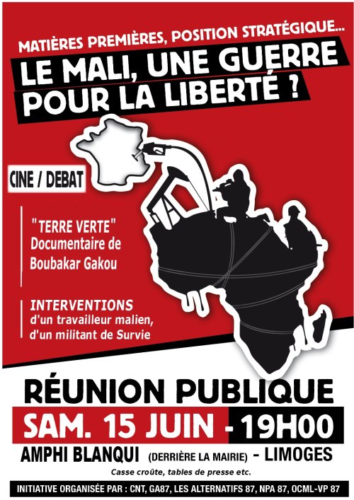 Venez en débattre le samedi 15 juin à partir de 19h00 dans l’amphi Blanqui (derrière la mairie), avec entre autres la projection du documentaire « Terre Verte » réalisé par Boubakar Gakou et les interventions d’un travailleur malien et d’un membre de l’association Survie.