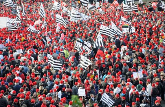 Les bonnets rouges ne tombent pas du ciel. Pour l’anecdote : c’est sur la commande personnelle du patron d’Armor Lux que 900 de ces bonnets ont été livrés, puis vendus à la criée à la manifestation du 2 novembre à Quimper. Les bonnets suivants sont produits en Ecosse, les défenseurs du « vivre, décider et travailler en Bretagne » n’étant pas à cette contradiction près. La manifestation, fortement suivie, est en effet appelée sous ce mot d’ordre par un comité dont la composition dit toute la confusion : élu régionaliste, commerçant, propriétaire agricole, syndiqué ouvrier... Les patrons de la grande distribution, du textile, de l’agroalimentaire étaient pour tout dire les organisateurs de la manifestation de Quimper, présents pour certains. Mais bien sûr, seuls les petits-bourgeois, plus présentables, ont occupé le devant de la scène et monopolisé la parole, canalisant de façon habile la rage des masses présentes sur le thème : « Bretons, serrons-nous les coudes ».