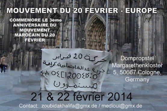 Le 21 et le 22 février 2014, des Marocains vivant en Europe (France, Allemagne, Italie, Belgique) se sont réunis à Cologne pour célébrer le 3e anniversaire du Mouvement du 20 février. L’occasion pour les marxistes-léninistes de se retrouver avec d’autres tendances démocratiques marocaines (collectif des amazigh démocratiques en France et le Mouvement Républicain Marocain). Au programme un rassemblement dans un quartier populaire multiculturel le 21. Le soir, une soirée festive et politique entre les militants présents. Le 22, un rassemblement devant la cathédrale de Cologne, présence d’une cinquantaine de personnes. Slogans révolutionnaires, prise de parole, banderole, portraits de martyrs révolutionnaires. Des Kurdes et des Allemands marxistes-léninistes ont apporté leur soutien. Le soir, débat public sur le mouvement du 20 février, les perspectives militantes révolutionnaires au Maroc. Et la soirée s’est terminée avec de la musique et de la poésie. Un communiqué a été produit à cette occasion par les militants présents :