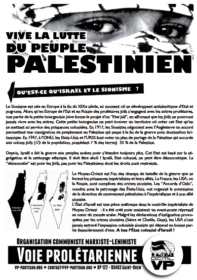 Pendant l’été 2014, des milliers de personnes ont manifesté, des jeunes, de prolétaires, révoltés par la barbarie sioniste et la complicité du gouvernement français. Les militants de l’OCML-VP ont pris part à ces manifestations. Depuis que nous existons, nous avons pris part directement, ou relayer activement, à de nombreuses les initiatives de solidarité concrète et directe avec le peuple palestinien : soutien aux prisonniers politiques (notamment Georges Abdallah ou Ahmad Saadat), actions de boycott des produits israéliens, collectes de soutien à des associations palestiniennes... Cela partout où nous militons (quartiers, syndicats, collectifs, associations) pour faire progresser la solidarité avec la Palestine.