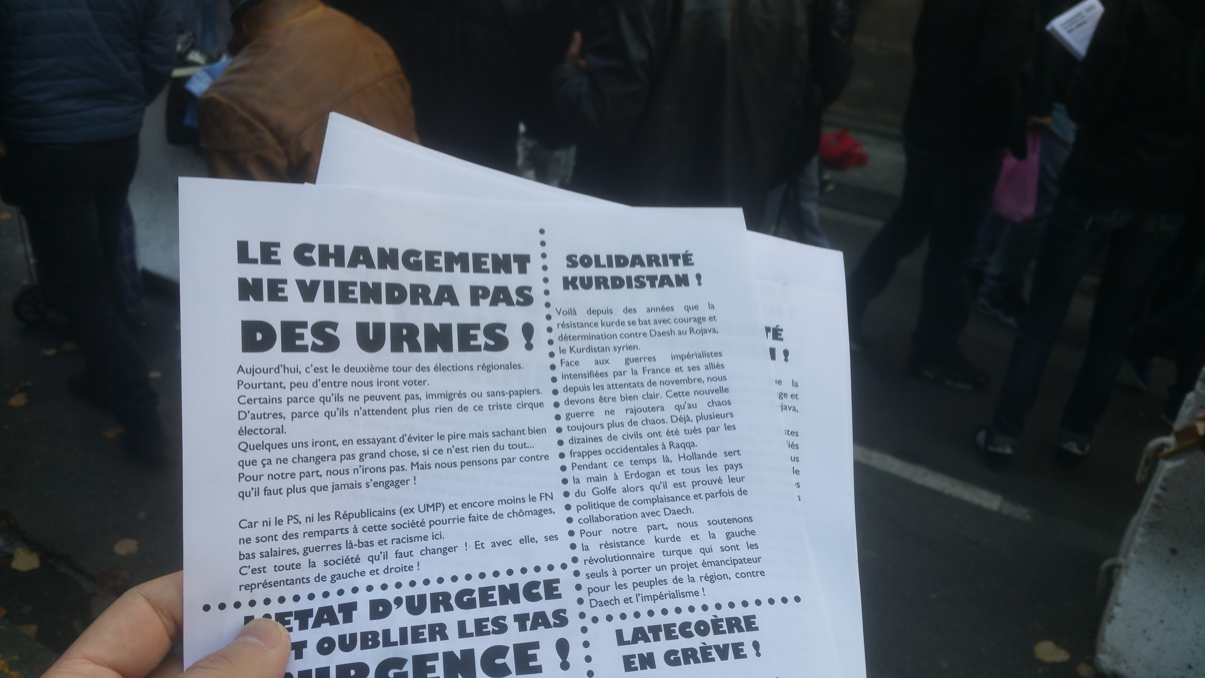 Car ni le PS, ni les Républicains (ex UMP) et encore moins le FN ne sont des remparts à cette société pourrie faite de chômages, bas salaires, guerres là-bas et racisme ici.