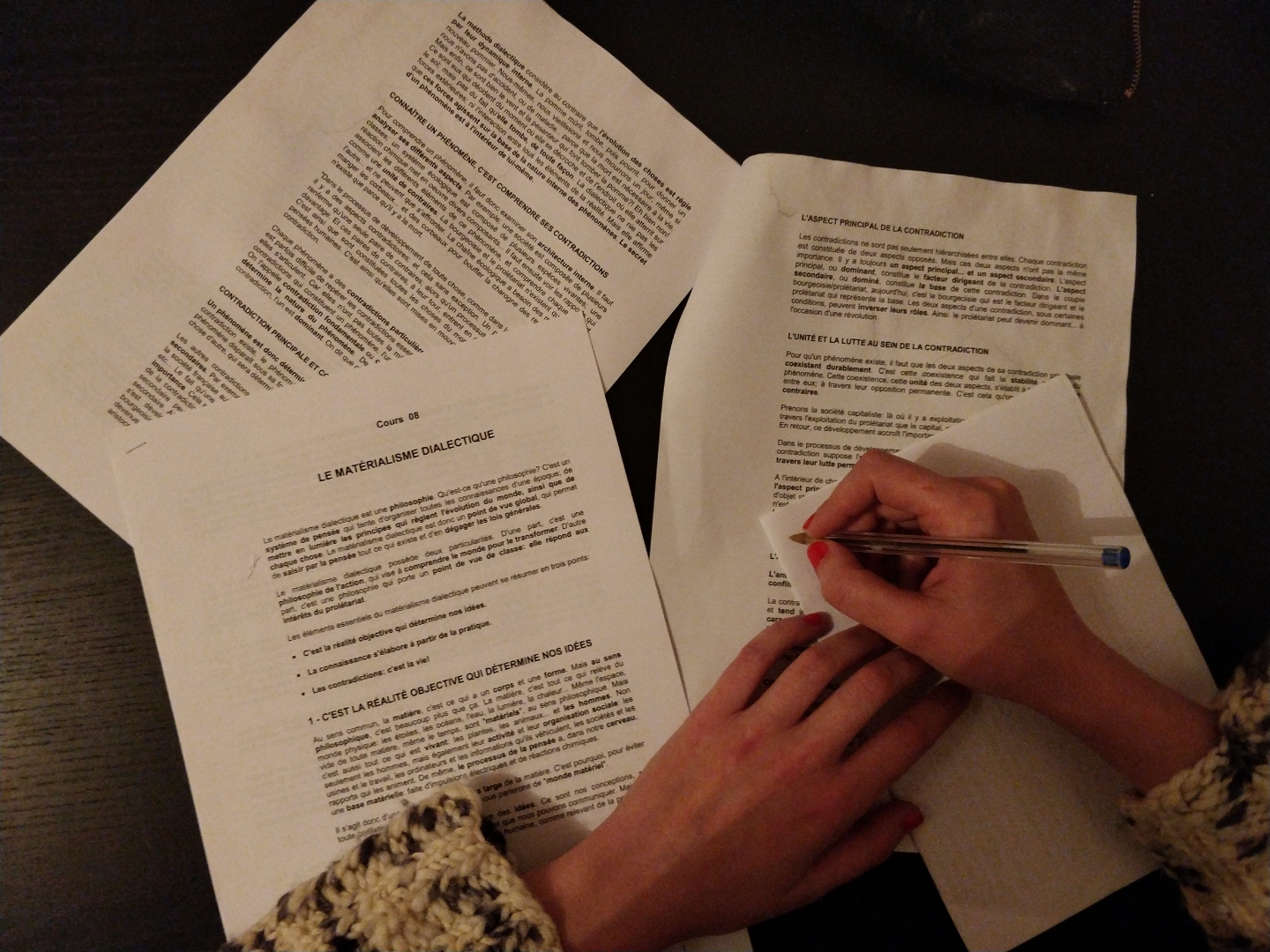 Puis nous avons abordé la contradiction à travers l’exemple (tiré de notre expérience politique) d’une blanchisserie industrielle, pour voir comment la dialectique s’oppose à la métaphysique.