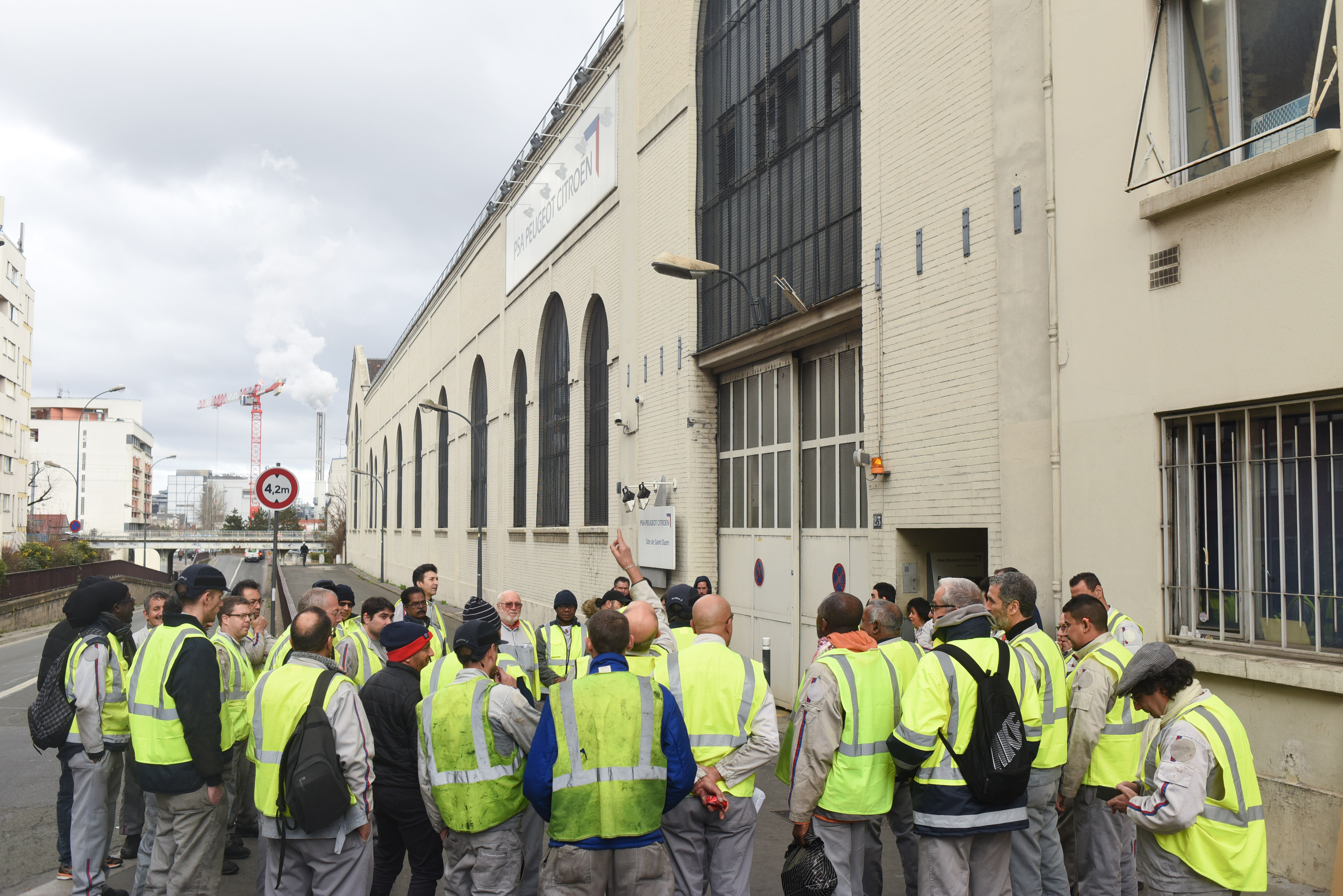 Ce sont des ouvriers de PSA Saint-Ouen, devant la porte de leur usine. Ça fait des mois que leur direction les balade, leur parle d’abord de « décroissance pilotée » de l’usine, les pousse à s’adresser à un cabinet de reclassement présent en interne, ferme un atelier entier, le ferrage, et annonce finalement la fermeture totale pour 2021.