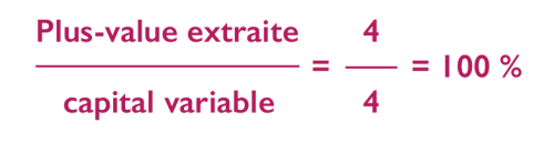 La plus-value extraite par le capital est donc de 4 heures par jour. Pour obtenir ces 4 heures, le capitaliste doit avancer un capital variable (= salaire) de 4 heures. On calcule ainsi le taux de plus-value directe du capitaliste :