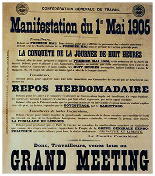 La date du 1er mai, on le sait, a été choisie à cause des morts de Chicago de mai 1886. Les syndicats américains, lors de leur congrès de 1884, s’étaient fixés deux ans pour obtenir les 8 heures. Le samedi 1er mai 1886, une grande manif est suivie de grèves dans de nombreuses usines de Chicago. Le 3 mai, la police fait trois morts parmi les ouvriers de Mc Cormick Harvester. Le 4, la manifestation de protestation fait encore trois morts parmi les ouvriers, mais sept parmi les flics. Le tract d’appel précisait : « Travailleurs, armez-vous et faites une démonstration de force » !
