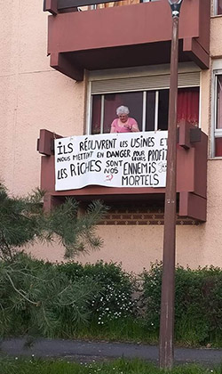 Macron a dit que nous étions « en guerre » lundi dernier. C’est une manière d’exiger qu’on la ferme et qu’on obéisse comme des petits soldats. Qu’on obéisse aux intérêts du Capital, d’abord en continuant à bosser au risque de notre vie. Les ministres nous menacent, pas question de Droit de retrait. Puis en acceptant les mesures anti-ouvrières déjà annoncées pour « relancer l’économie », comme le pouvoir accru donné aux patrons de sucrer nos congés et de manipuler notre temps de travail. Des milliards ont déjà été promis aux entreprises, mais rien pour le système de Santé ou les travailleurs. Ah, si, peut-être une prime de 1000 euros pour nous encourager à continuer à bosser... Voilà combien vaut notre vie ! Au final, ce sera toujours à nous, les prolétaires et le peuple, de payer la facture pour nos exploiteurs.