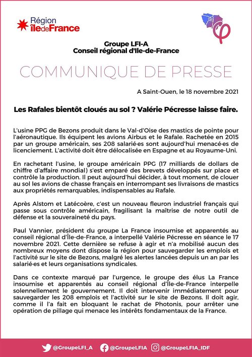 Les élus insoumis au Conseil Régional d’Ile de France ont publié le 18 novembre un communiqué malheureusement trop confidentiel en défense des travailleurs de PPG (Bezons) menacés de licenciement. Jusque-là rien à dire, les PPG se battent durement (et justement) pour l’emploi et contre les licenciements, aux côtés des TUI et d’autres, et sont les principaux animateurs des manifestations en défense de l’emploi, celle du 23 janvier, et celle plus récente du 27 novembre. Manifestations où l’on voit les élu.e.s FI toujours en bonne place, iels sont présent.e.s, toujours rien à dire.
