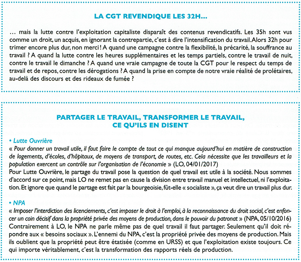 Les réformistes parlent de diminuer le temps de travail mais accompagnent tranquillement les réformes anti-ouvrières du capitalisme en crise. Tout au plus parlent-ils d’améliorer les conditions de travail, le rendre moins pénible, « l’enrichir »… mais sans remettre en cause l’exploitation capitaliste, l’aliénation, la division entre travailleurs manuels et intellectuels, avec un tri social effectué de plus en plus tôt par l’éducation nationale ; les disparités entre les villes et les campagnes ; les rapports de domination homme/femme.