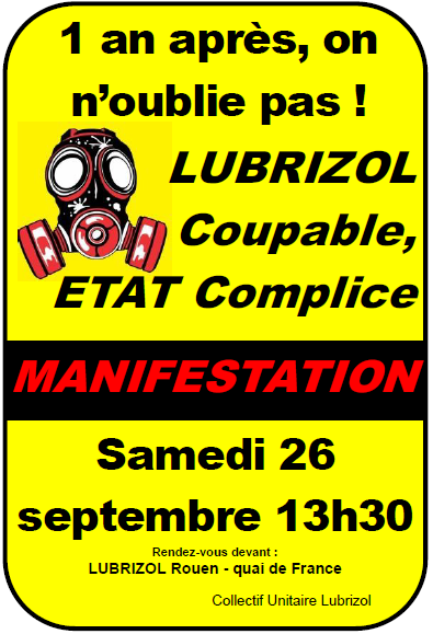 Le 26 septembre, grosse manifestation devant l’usine pour l’anniversaire de l’accident, plus d’un millier de manifestants à défiler vers le Palais de Justice en passant par la préfecture, à l’appel du collectif unitaire qui regroupe, syndicats, partis, associations de victimes et de défense de l’environnement.