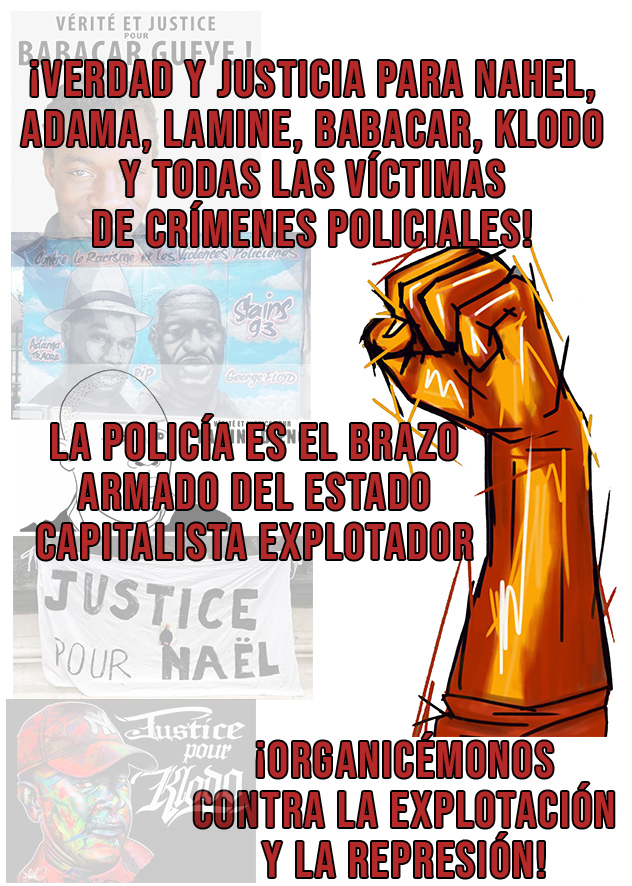 Los jóvenes tienen razón al enfrentarse a la policía, son el brazo armado del Estado que no se puede mejorar, hay que combatirlos hasta las últimas consecuencias. En una sociedad de clases, la policía siempre ha estado y estará al servicio de los explotadores, enemiga de los proletarios. El racismo, y más en general las ideas fascistas, impregnan a la mayoría de los policías, y explican su estallido diario de violencia. Sí, ¡policía = asesinos !