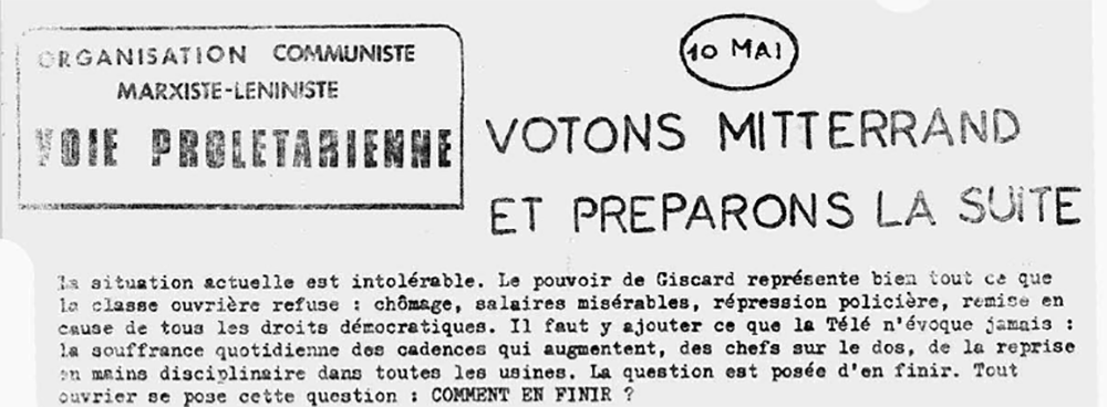 Notre objectif à nous, ce n’est pas de construire une secte de purs et durs, mais c’est de construire un parti révolutionnaire qui marchera en tête de la classe ouvrière. Voilà pourquoi nous n’avons pas peur de faire l’expérience et même nous souhaitons que l’expérience se fasse : elle nous donnera raison. POUR CELA, NOUS VOUS APPELONS À VOTER MITTERRAND.