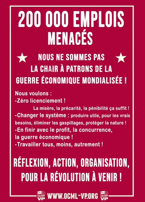Dans les régions, c’était différent. Beaucoup de petits rassemblements, dans de nombreuses villes moyennes, avec une participation significative : un PSE dans la seule usine d’une petite ville est vite un drame. Nous étions par exemple présents à Caen, devant la préfecture, 200 personnes et un bon accueil, avec notre plateforme emploi (voir https://ocml-vp.org/article2215.html), notre nouvel autocollant contre les licenciements (que nous avons choisi de diffuser largement comme un tract – disponible à notre BP), et la déclaration sur la chute de Assad en Syrie (voir https://ocml-vp.org/article2701.html).