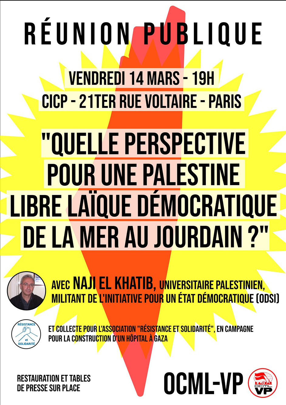 L’OCML Voie Prolétarienne organise un meeting public au CICP le Vendredi 14 mars, avec la participation de Naji El Khatib, militant palestinien de l’Initiative pour un Etat Démocratique (ODSI), et de "Résistance et Solidarité" qui construit un hôpital de campagne à Gaza avec l’ONG Al Awda.