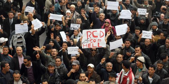 Ben Ali chassé, la lutte change d’enjeu. Le Gouvernement intérimaire a été formé avec huit ministres de Ben Ali dont quatre aux postes clés, trois membres des partis d’opposition et des représentants de la société civile, dont des membres de UGTT. Cette composition témoigne de la volonté de la bourgeoisie tunisienne, une fois débarrassée du fardeau Ben Ali, de rétablir un ordre social qui restera conforme au précédent. Même si c’est avec moins de violence que les semaines précédentes, les forces de police dispersent encore sans ménagement les manifestants qui protestent contre ce gouvernement, qualifié par eux de « mascarade », car il fait la part belle au RCD.