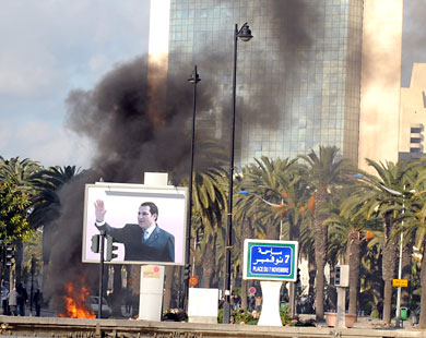 Les forces de police se déchaînent contre les manifestants. Mais l’armée reste en retrait. Après trois semaines de révolte le général Rachid Ammar, chef de l’armée de terre, qui a refusé de faire tirer sur les manifestations, est destitué. Des soldats expriment leur sympathie avec les manifestants sans passer ouvertement de leur côté. Le 12 ou le 13 janvier, l’armée fait savoir à Ben Ali qu’il doit partir. De leur côté les Américains ne sont pas inactifs. Pour eux la région est stratégique. Depuis plusieurs années, ils entretiennent des relations avec les opposants démocratiques ou islamistes, malgré les protestations de Ben Ali. Ainsi, après la libération d’un dirigeant de Ennahda, mouvement islamiste, la première visite que ce dernier reçoit est celle de l’Ambassadeur des Etats-Unis. Celui-ci a été l’adjoint de Bremer en Irak, où il a préparé le plan de « démocratisation ». Les USA ont depuis longtemps deux fers au feu : Ben Ali et ses opposants. Selon le journal Le Monde, ils auraient fait savoir à Ben Ali, par l’intermédiaire de l’Arabie saoudite, qu’il était temps qu’il parte. Les contradictions des classes dominantes s’aggravent. Le pouvoir perd une part de ses appuis militaires. La bourgeoisie capitaliste voit alors la possibilité de se débarrasser de « ses prédateurs ». Au plan international Ben Ali ne peut plus guère compter que sur l’UE et sur le gouvernement Sarkozy.
