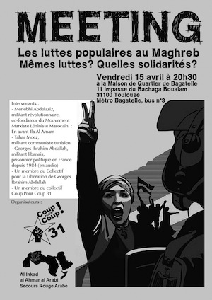 Meeting le 15 avril à 20h30 à la Maison de Quartier de Bagatelle. Co-organisé par le collectif Coup Pour Coup 31 et le Secours Rouge Arabe sur le thème : "Les luttes populaires au Maghreb. Mêmes luttes ? Quelles solidarités ?".