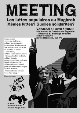 Le vendredi 15 avril 2011, le cercle Coup Pour Coup 31 co-organisait avec le Secours Rouge arabe un meeting sur les luttes populaires au Maghreb.