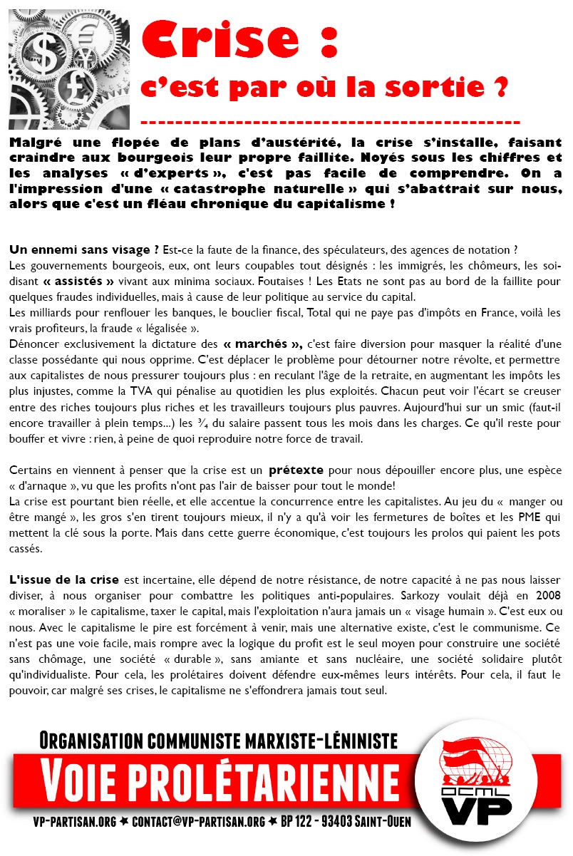 L’issue de la crise est incertaine, elle dépend de notre résistance, de notre capacité à ne pas nous laisser diviser, à nous organiser pour combattre les politiques anti-populaires. Sarkozy voulait déjà en 2008 « moraliser » le capitalisme, taxer le capital, mais l’exploitation n’aura jamais un « visage humain ». C’est eux ou nous. Avec le capitalisme le pire est forcément à venir, mais une alternative existe, c’est le communisme. Ce n’est pas une voie facile, mais rompre avec la logique du profit est le seul moyen pour construire une société sans chômage, une société « durable », sans amiante et sans nucléaire, une société solidaire plutôt qu’individualiste. Pour cela, les prolétaires doivent défendre eux-mêmes leurs intérêts. Pour cela, il faut le pouvoir, car malgré ses crises, le capitalisme ne s’effondrera jamais tout seul.