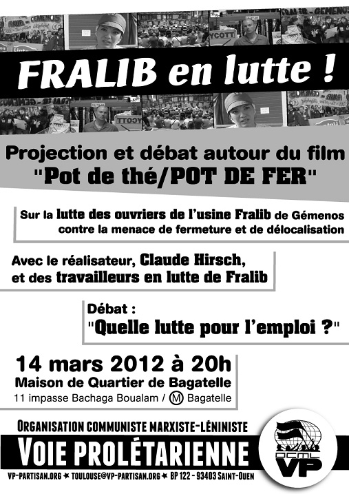 L’OCML-VP Toulouse vous invite à une projection-débat autour du film "Pot de thé/Pot de fer" sur la lutte des ouvriers de Fralib de Géménos contre la menace de fermeture et de délocalisation.