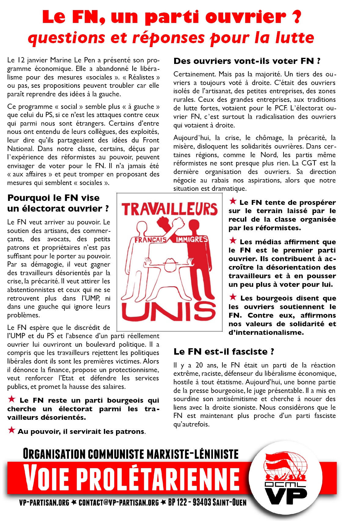 Ouvriers de toute origine, opposons nos valeurs de solidarité internationaliste au mépris des bourgeois, au racolage raciste et diviseur du FN. Valeurs de la Commune de Paris, des Révolutionnaires russes, des FTP Partisans dans la résistance au nazisme.