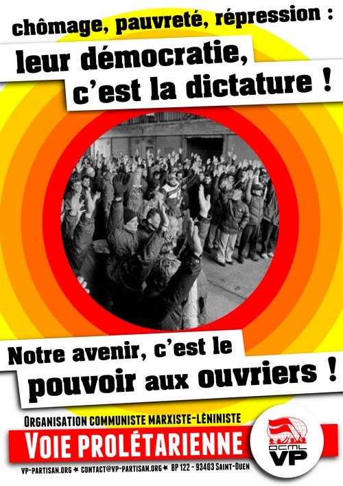 L’OCML VOIE PROLETARIENNE affirme que si nous voulons que nos vies changent vraiment, nous devons nous organiser pour prendre le pouvoir. Le pouvoir politique et économique des ouvriers et des prolétaires sur toute la société. Ayons confiance en nos propres capacités collectives, c’est nous qui faisons déjà tourner la société ! Refusons de confier notre avenir aux beaux parleurs réformistes qui nous disent « prenez le pouvoir ! » pour se faire élire. Pour un avenir, sans exploitation ni guerre, il faut agir, et prendre nos affaires en mains. En sachant que nous n’avons que deux avenirs possibles : la barbarie capitaliste faite d’exploitation, de guerres et de misère, et le nôtre, le chemin de l’organisation de notre classe pour le renversement du capitalisme.