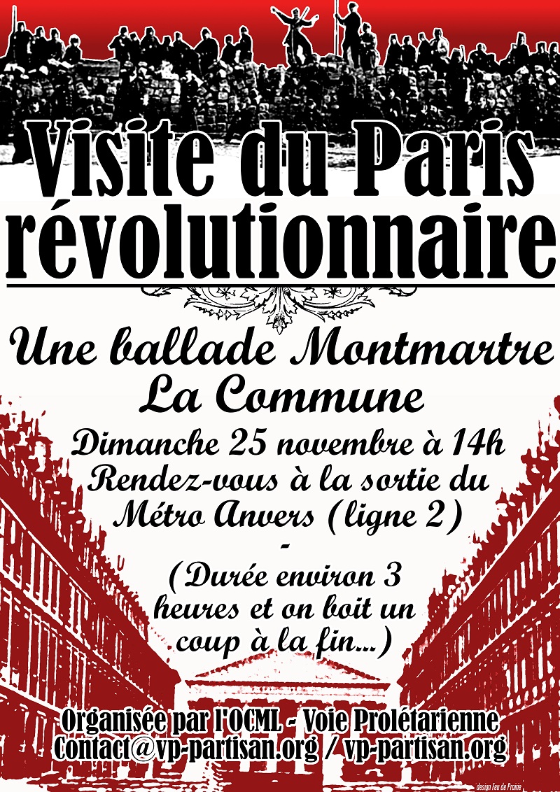 Militer > Visite du Paris révolutionnaire Tracts 2012-11-03 Visite du Paris révolutionnaire Ballade - Paris L’OCML-Voie Prolétarienne de Région Parisienne vous invite à une ballade Montmartre La Commune Dimanche 25 novembre à 14h Rendez-vous à la sortie du Métro Anvers (ligne 2) (Durée environ 3 heures et on boit un coup à la fin...)