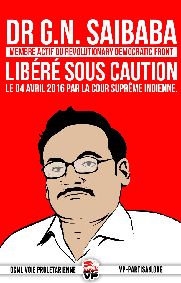 Le Dr G.N. Saibaba, membre actif du Revolutionary Democratic Front (Front Révolutionnaire Démocratique), vient d’être libéré sous caution par la Cour Suprême indienne.