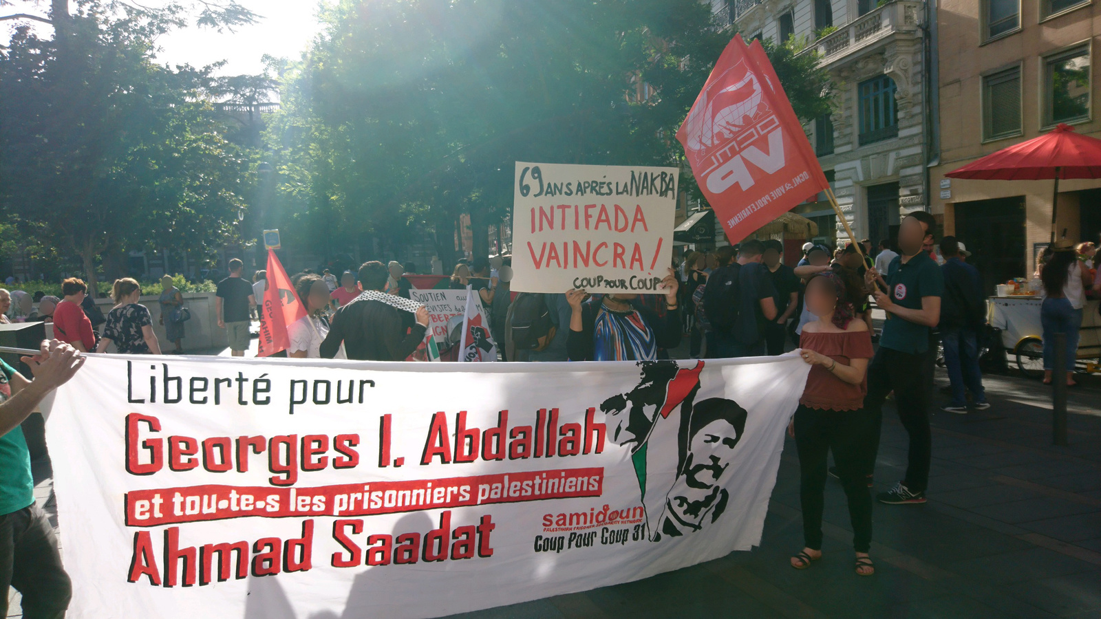 Pendant près d’une heure, autour d’un immense drapeau palestinien déployé et de pancartes et drapeaux exigeant la libération d’Ahmad Sa’adat [1], Georges Abdallah et tous les prisonniers palestiniens, la centaine de manifestants a affirmé son soutien à la résistance palestinienne.