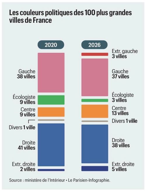 Globalement, contrairement à tout ce qui se dit, ce qu’il faut noter dans le résultat des élections c’est quand même la stabilité du vote en termes de classe, avec une forte poussée de l’abstention et une évolution à la marge des rapports de forces. Nous suivons depuis des années un panel d’une trentaine de communes populaires, grandes et petites, dans toute la France, regroupant 1 250 000 inscrits, un échantillon non négligeable donc, même s’il n’est pas représentatif de l’ensemble. Ce qu’on voit c’est une hausse de l’abstention, une stabilité de l’extrême-gauche, une légère baisse de la gauche réformiste (LFI comprise) ; une légère hausse de la droite traditionnelle, et même un tassement de l’extrême-droite qui n’est présente que dans la moitié des communes. Bref, pas de quoi paniquer. Ça se voit également à la bascule des grandes villes, voir le tableau du Parisien ci-contre.